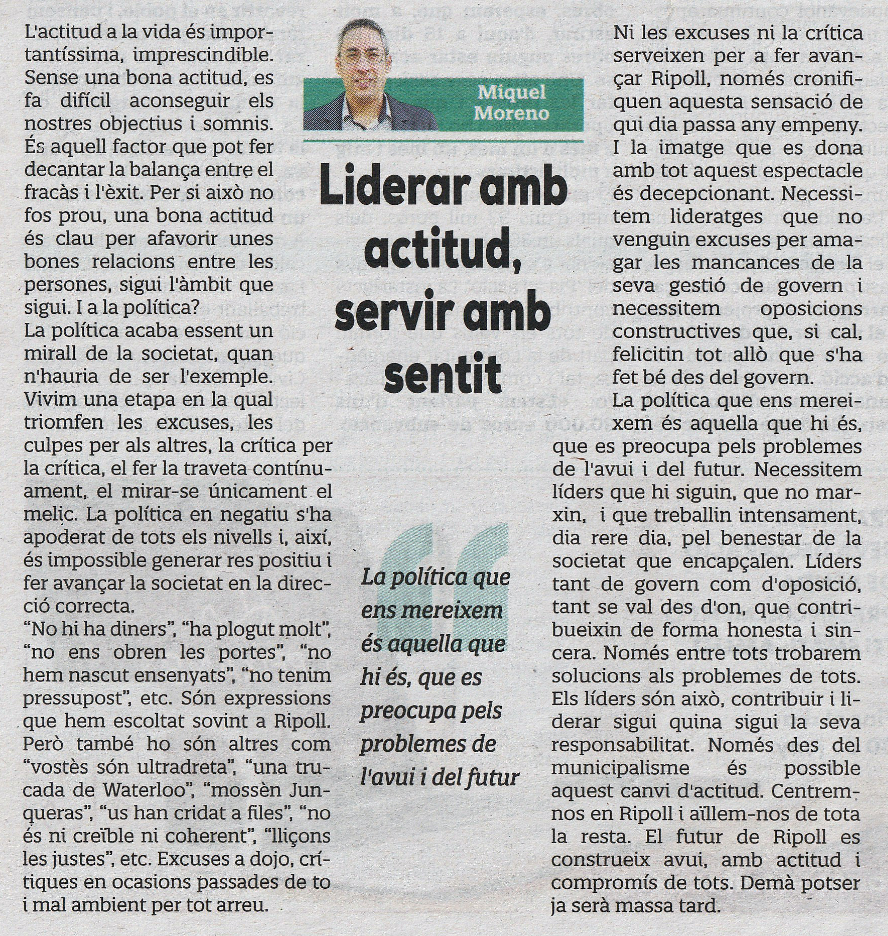 🗞️ Article d’en Miquel Moreno al diari El Ripollès del passat dijous 12 de Juny del 2025. #ripoll #somhiripoll #actitud #lideratge #servir